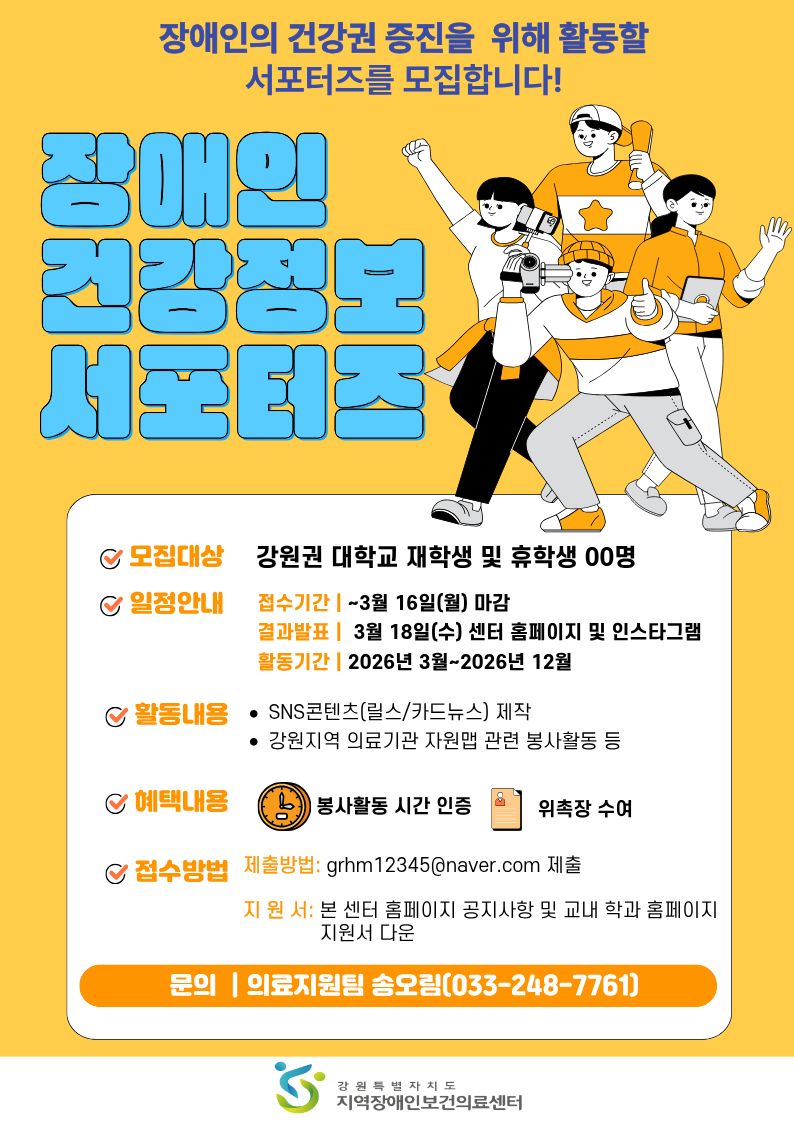 강원특별자치도 지역장애인보건의료센터에서는 장애인 건강권에 대한 인식 확산과 건강정보 제공을 위해 「장애인 건강정보 서포터즈」를 모집합니다.